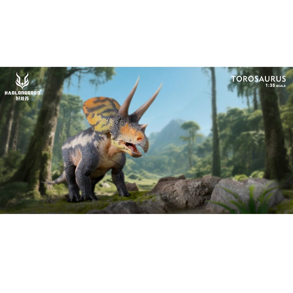 Haolonggood Torosaurus Wang Bo Dang, the yellow frilled Torosaurus dinosaur model. A fantastic Torosaurus in 1:35 scale. Everything Dinosaur supplies the Haolonggood Torosaurus Wang Bo Dang model with a Torosaurus fact sheet.