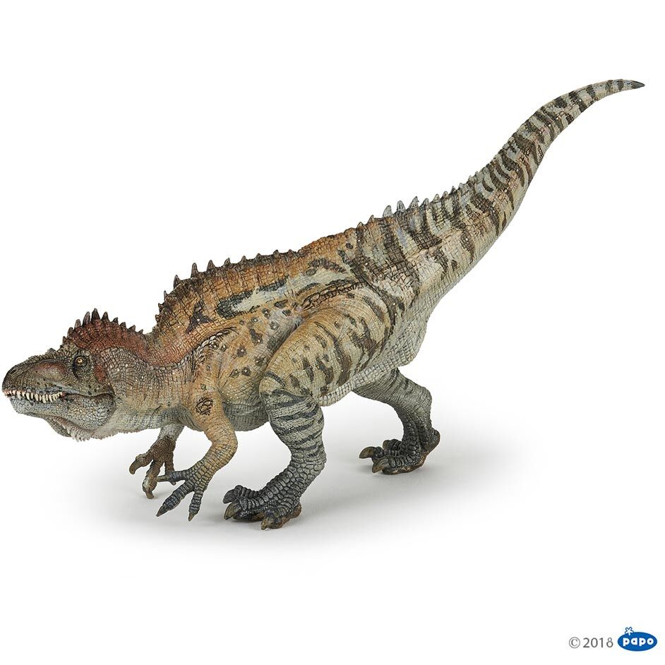 A Papo Acrocanthosaurus dinosaur model with an articulated jaw. A beautiful Papo Acrocanthosaurus with a tiger-inspired colour scheme.