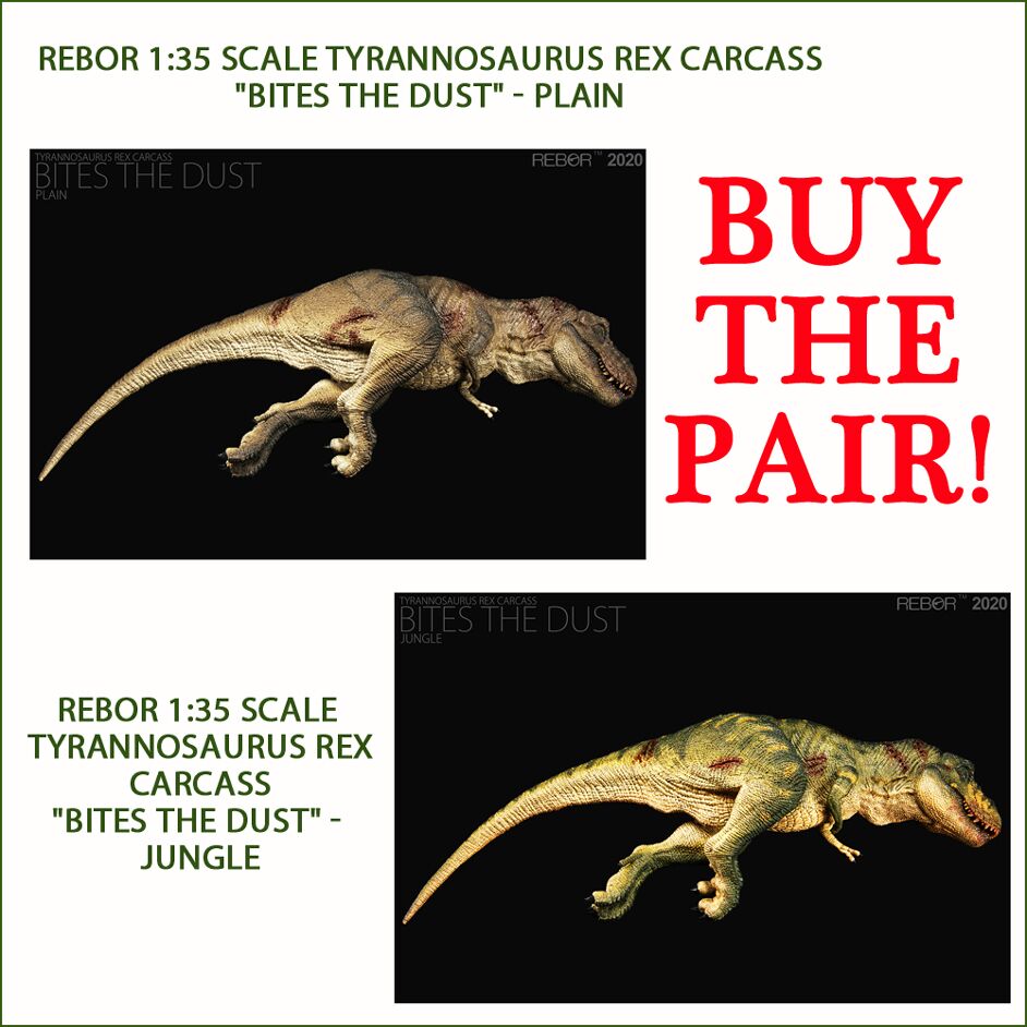 The amazing Rebor T. rex carcass Bites the Dust (jungle and plain) in 1:35 scale. Buy the pair! Everything Dinosaur supplies the Rebor T. rex carcass Bites the Dust (jungle and plain) with a Tyrannosaurus rex fact sheet.